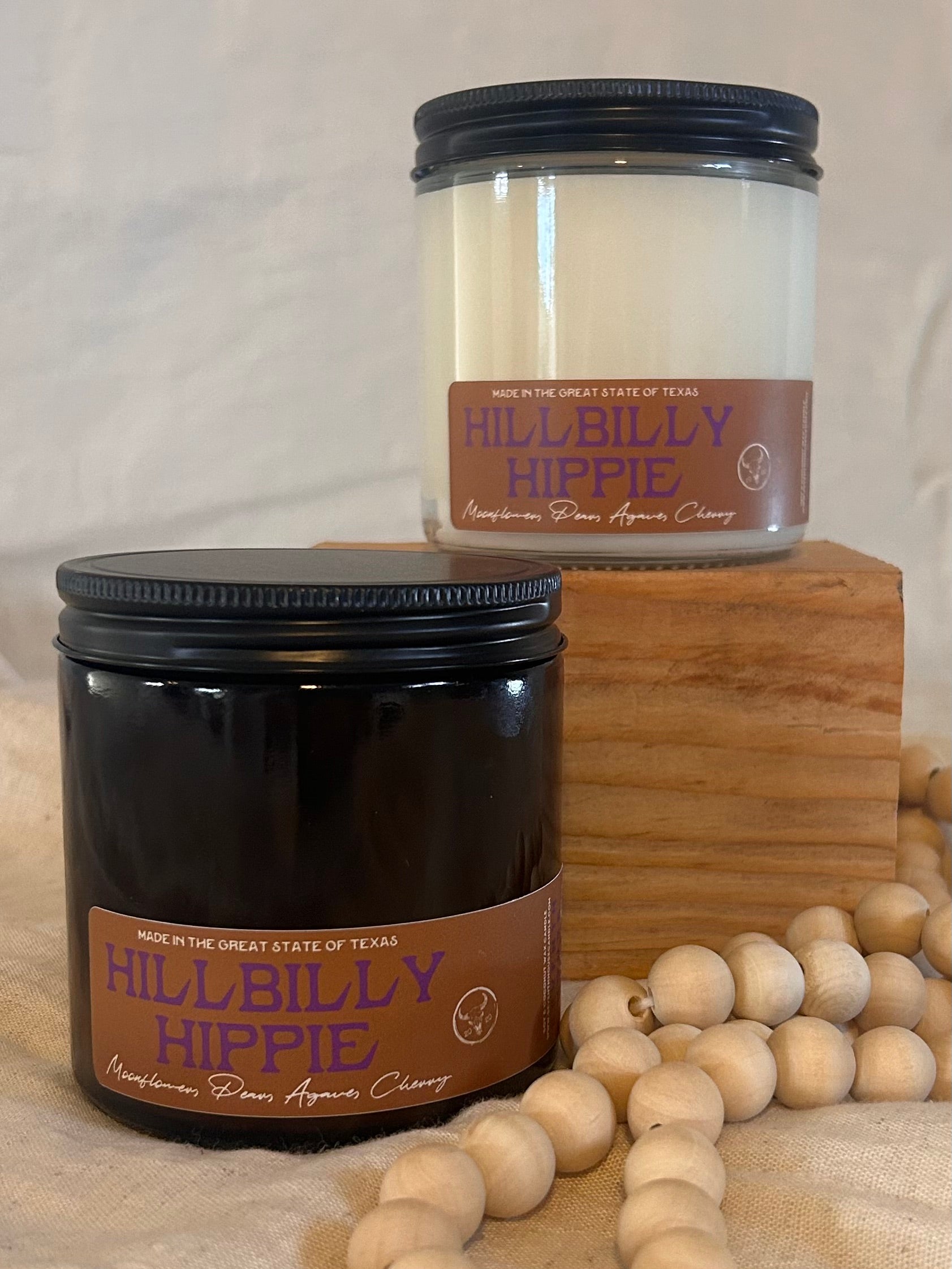 Our "Hillbilly Hippie" candle is a unique blend of florals, fruits and agave inspired by one of our favorite artist, Lainey Wilson. Top notes of juicy pear and agave merge with soft floral add a feminine touch and marine notes cocooned in a powdery blend of dark musk and amber bring warmth.