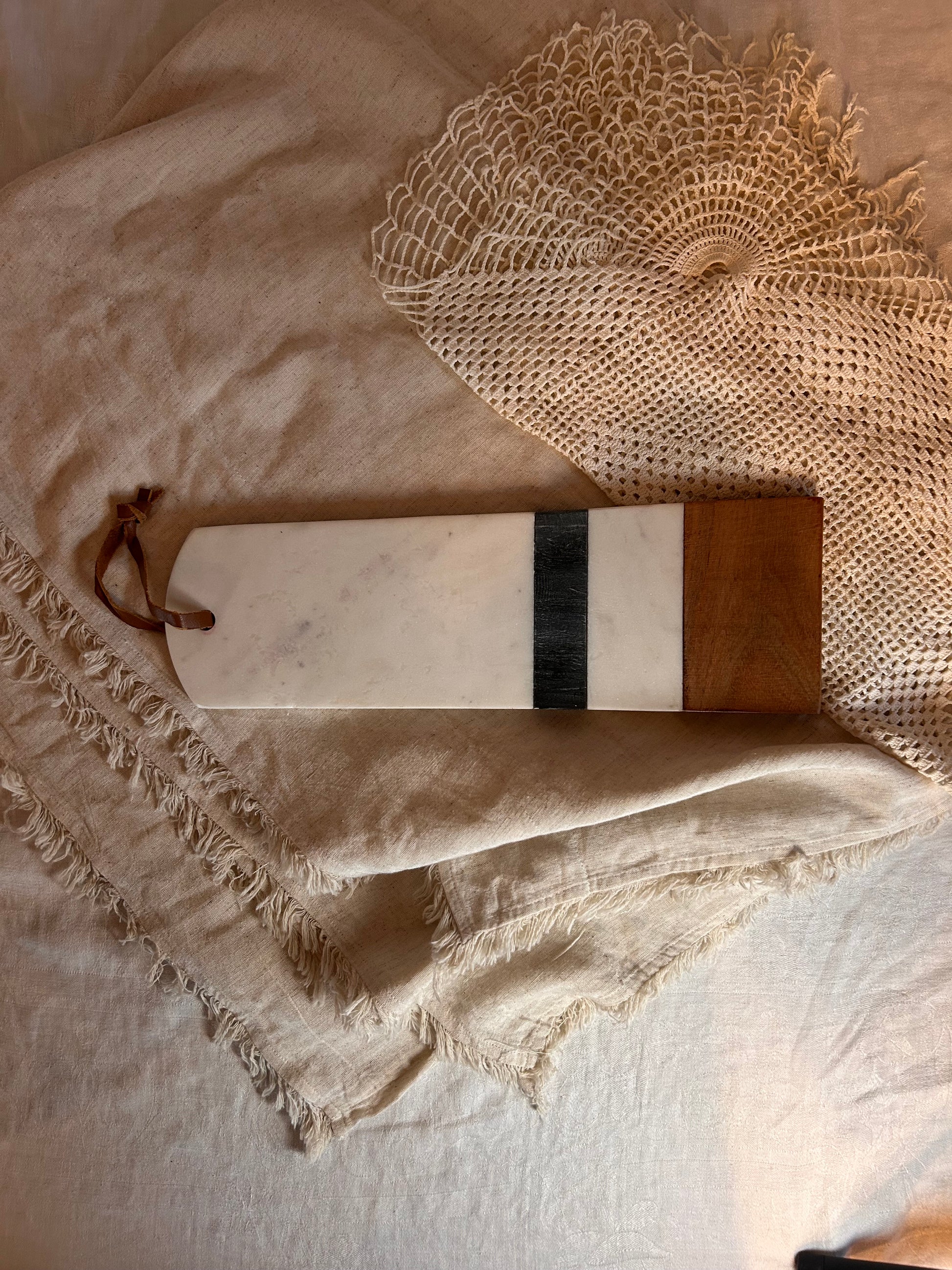Elevate the aesthetic of your modern farmhouse kitchen with this exquisite cutting board. Crafted from a blend of solid white and black marble, seamlessly fused with mango wood, this board is ideal for all of your food preparation and serving needs. The addition of a leather hanger adds a touch of elegance. This food-safe board not only serves as a functional piece, but also a stylish and decorative element for your kitchen.