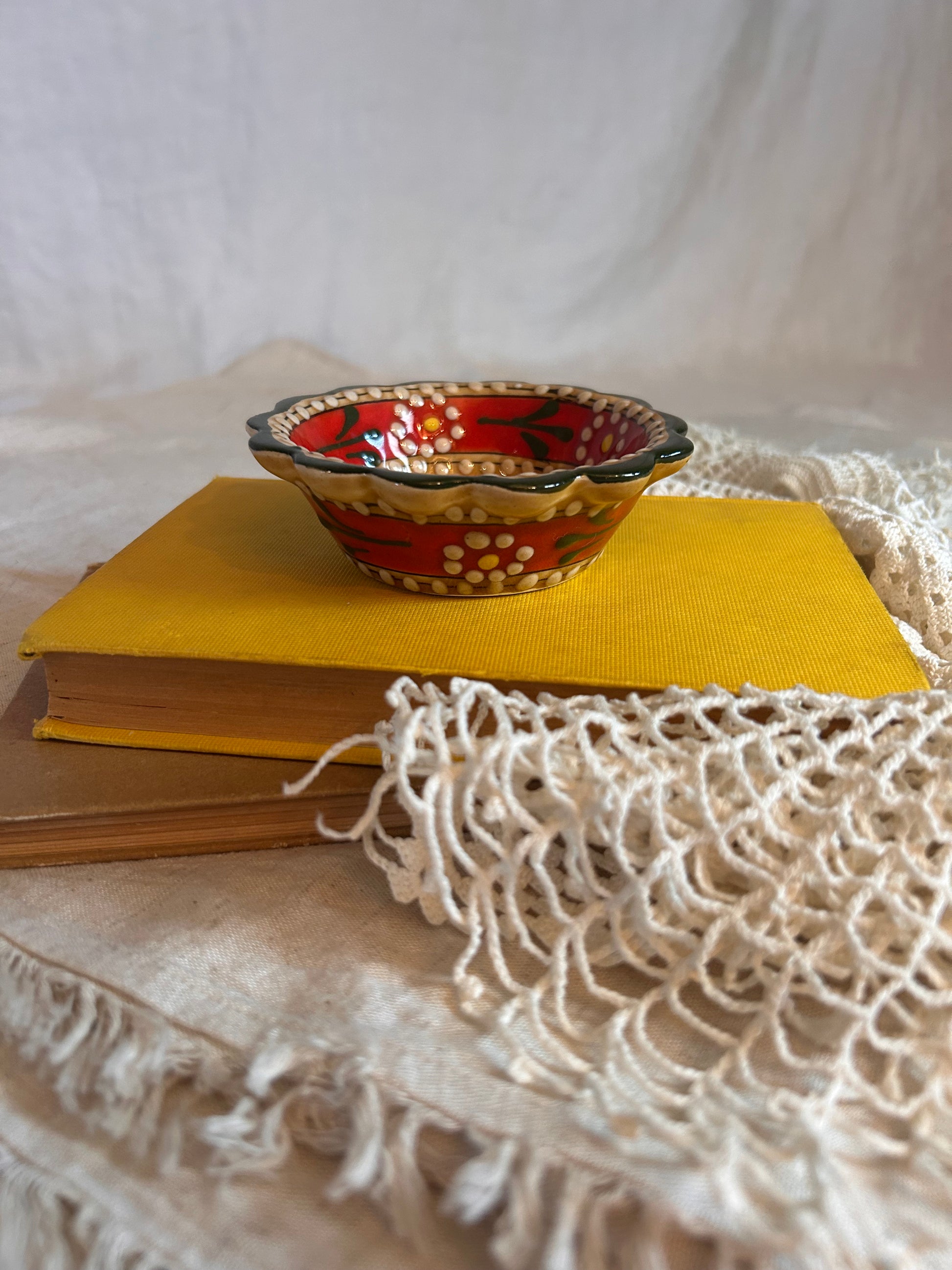 Discover the beauty of traditional craftsmanship with our handcrafted vintage Mexican bowl. Made from high-quality clay and finished with a lead-free glaze, each 4" bowl is a unique piece of art. The organic shape and hand-painted design feature a charming dot-style pattern of flowers and leaves, showcasing the rich heritage and skill of Mexican artisans. Perfect for a pinch bowl or jewelry bowl, adding a touch of elegance and culture.