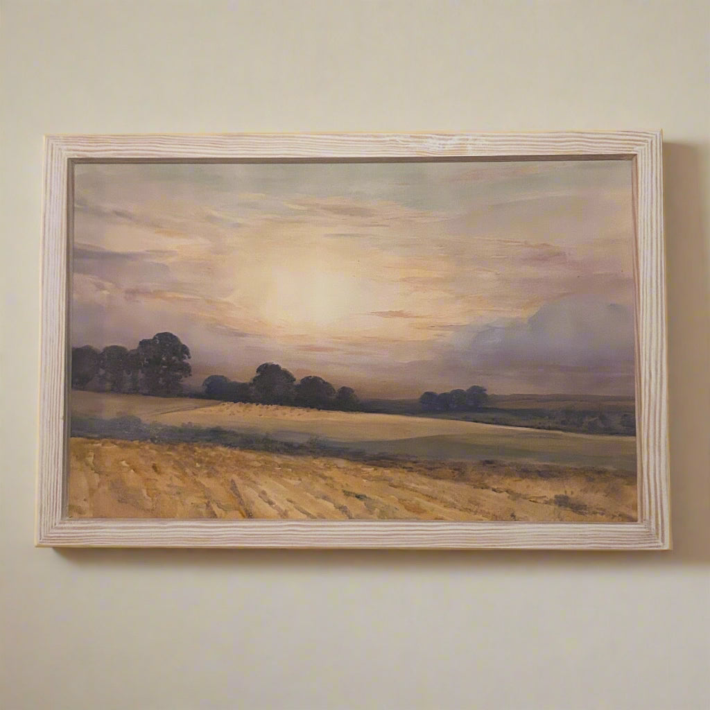 Experience the peaceful elegance of our art print painting featuring a breathtaking sunset scene over a vast open field with rolling grasses and majestic trees on the horizon. The muted color palette evokes a sense of tranquility and warmth as the sun sets.